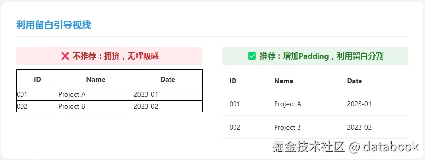 拥挤的表格让人窒息。给行与行、列与列之间留出“呼吸空间”(Padding)。