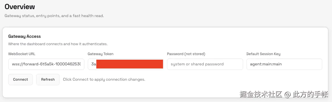 - 刚进去的时候,由于没有 token 你什么都操作不了。你需要在 Overview 中填入刚才的 token,点击 Connect 就能完成连接。
