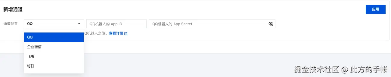 选择腾讯云的另一个原因就是它支持国内主流 APP:QQ、企业微信、飞书、钉钉。我想打造个人助手,因此就选择 QQ 作为通道(其余的三个太过正式)。没想到那么多年过去竟然还会用回 QQ,上一次似乎还是刚毕业的时候。