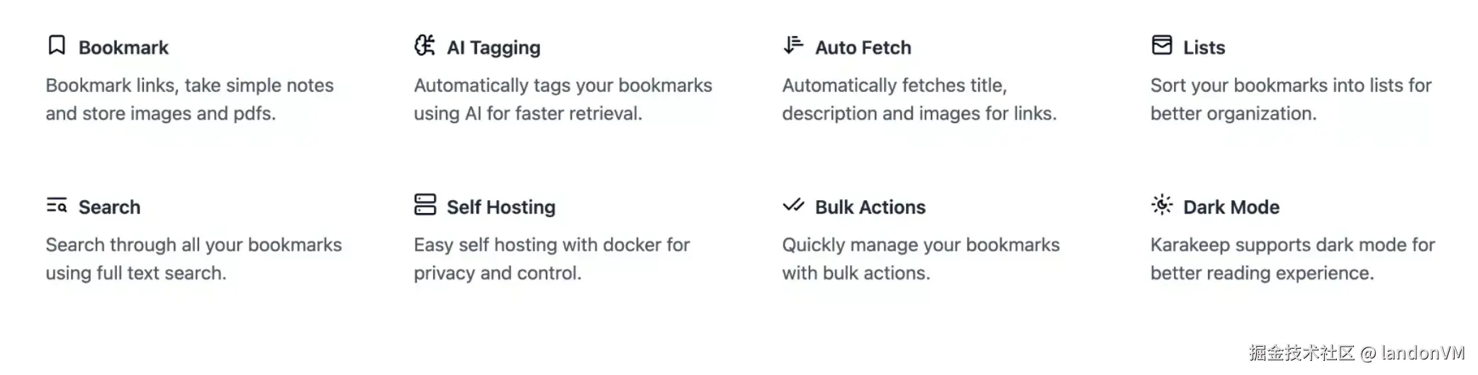 - 自动抓取链接信息:Karakeep会自动为每个书签抓取链接标题、描述以及预览图,方便快速识别。