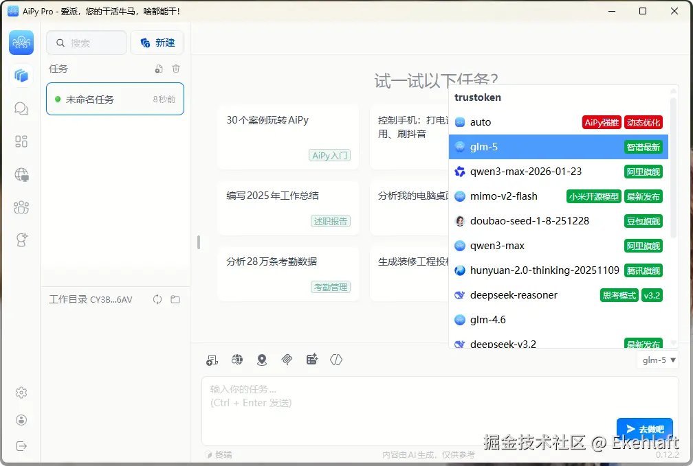 作为通用智能体平台,AiPy团队参与了GLM-5的提前内测,并已率先完成GLM-5的调试与适配,已正式上架至AiPy客户端。所有用户无需额外配置,您只需下载AiPy即可免费体验。