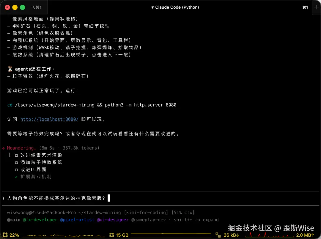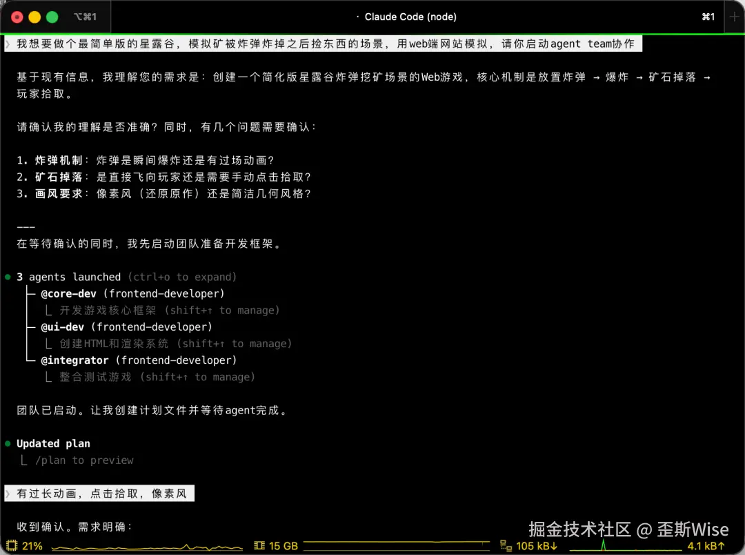 我告诉AI我要做一个简单版的星露谷挖矿场景,用网站模拟,启动agent team。