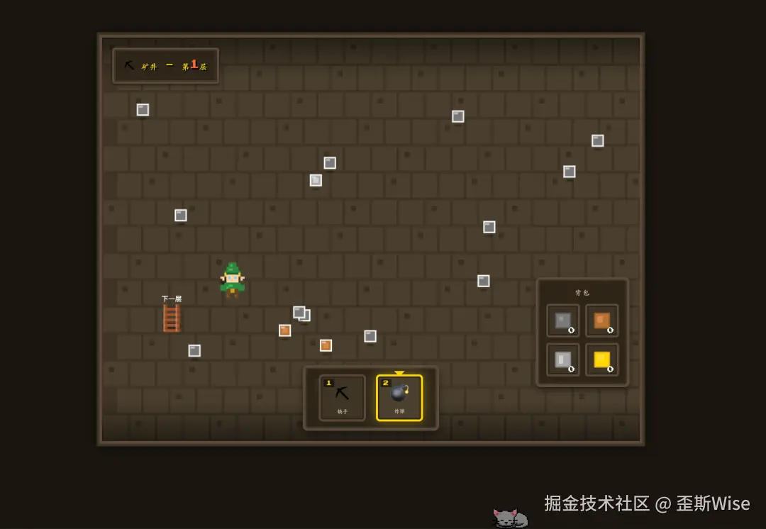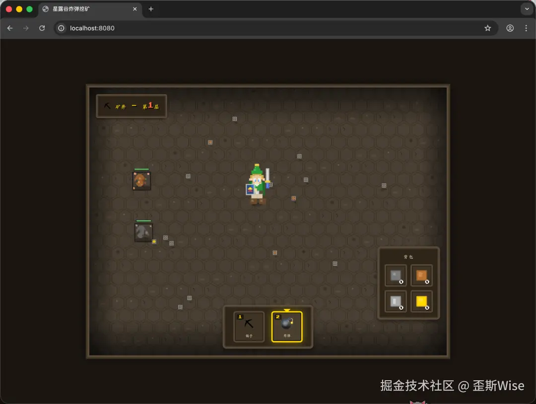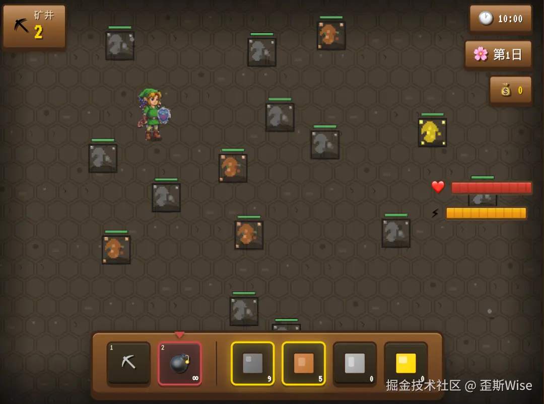 首先先看结果,林克在挖矿,能够支持放炸弹,挥铲子,自动捡东西。然后进入下一层。