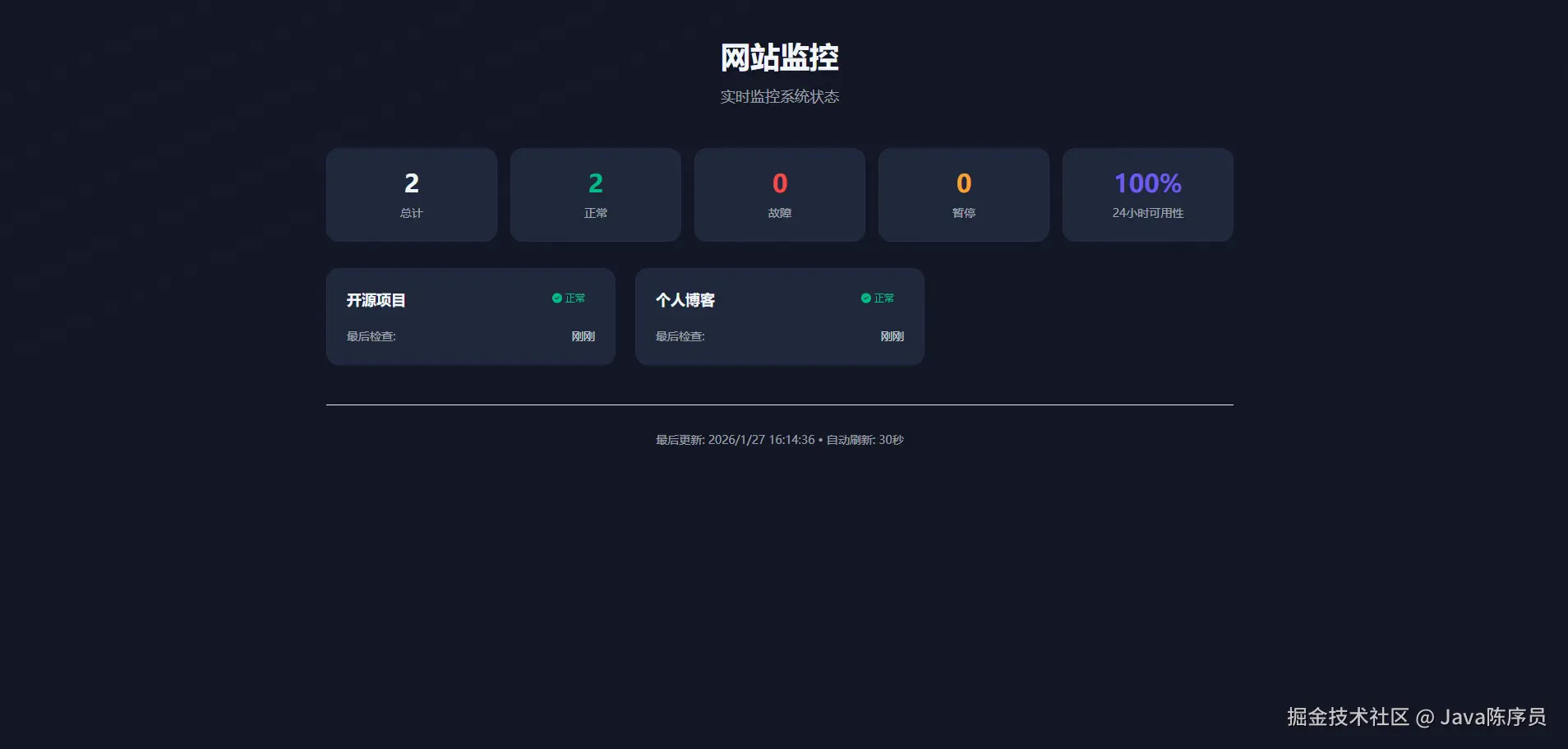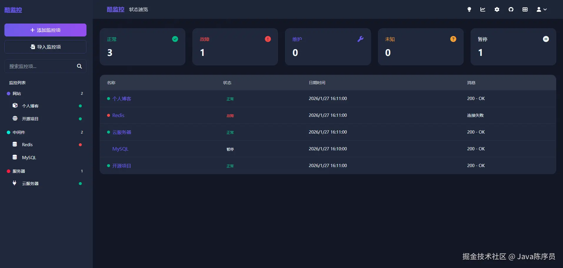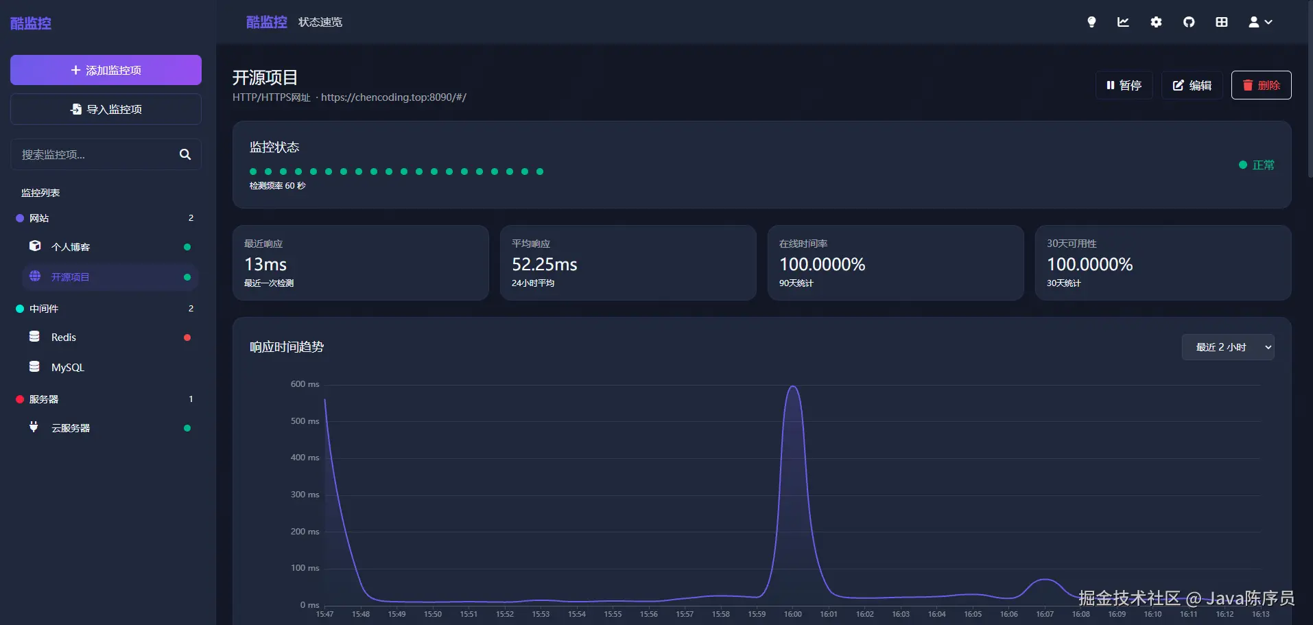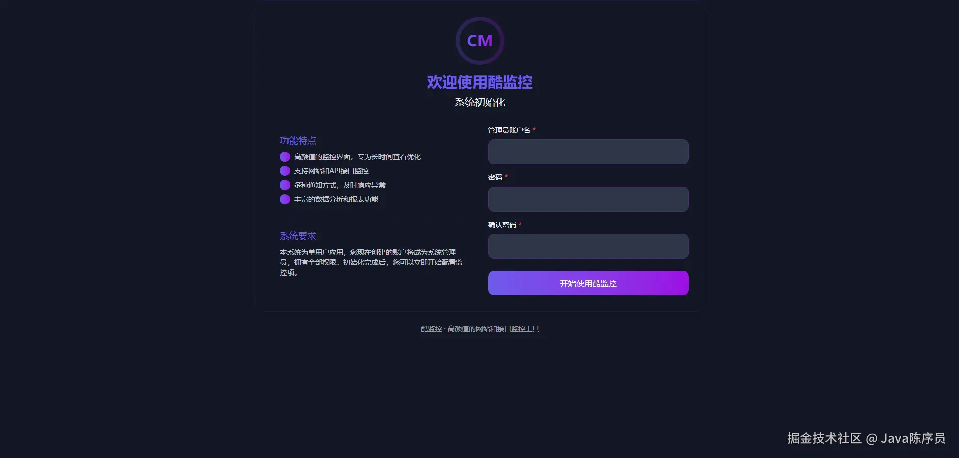 coolmonitor 没有复杂的配置项,能覆盖日常监控的核心需求,颜值高、易部署、易维护,不管是个人开发者监控自己的小网站,还是中小企业监控内部服务,都非常适用。快去部署体验吧~