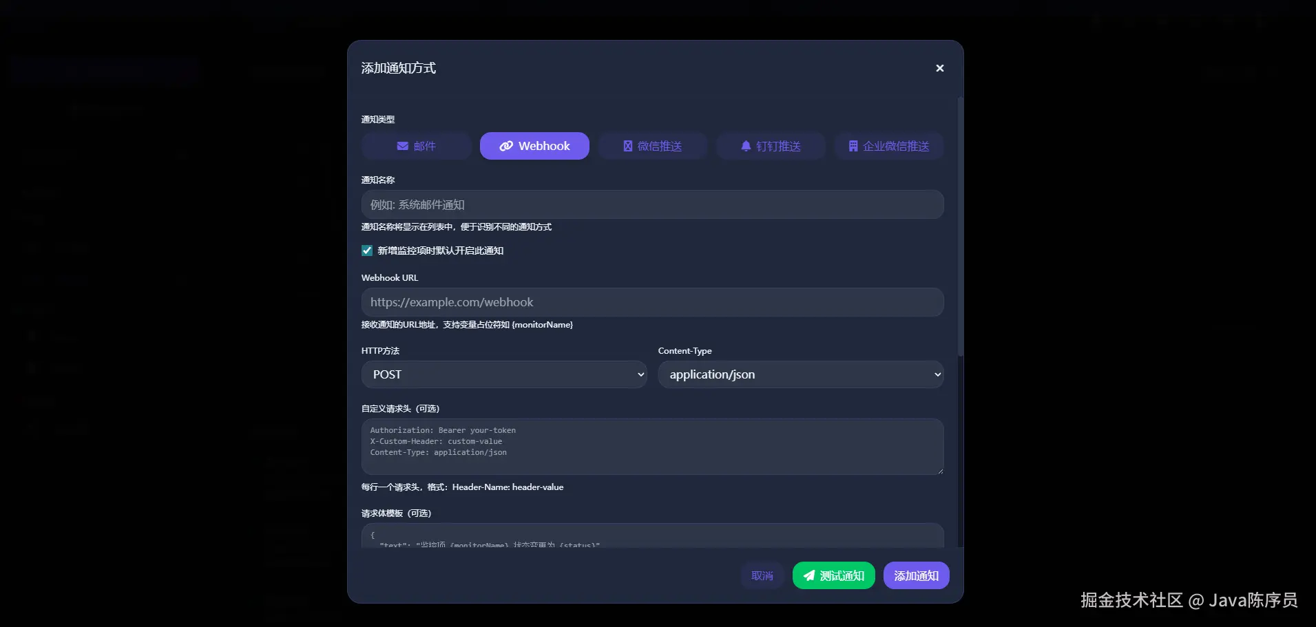 - 多渠道通知配置:支持邮件、Webhook、微信、钉钉、企业微信等多类型通知渠道