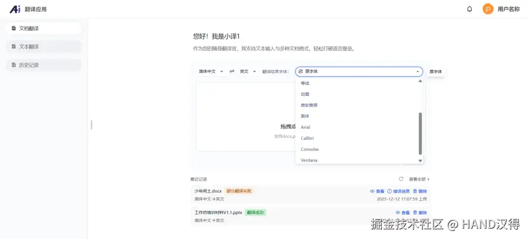 汉得灵猿AI中台的翻译助手,以文件翻译的全格式兼容与细节优化、文本翻译的即时响应与精准对照、历史记录的智能管理与问题追溯,为用户打造一站式翻译解决方案。无论是职场办公的商务文件、日常沟通的即时文本,还是需要反复核对的翻译成果,都能在这里得到高效、精准的处理。