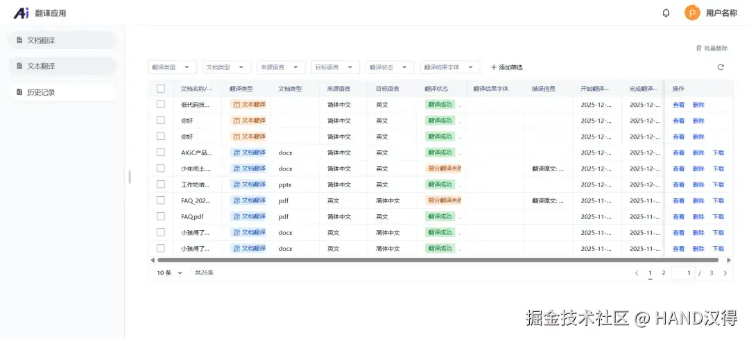 • 快捷操作:支持按语言、时间、文件类型等进行搜索与筛选,快速定位到目标记录;每条记录都配备 “查看”“下载”“删除” 等功能按钮;