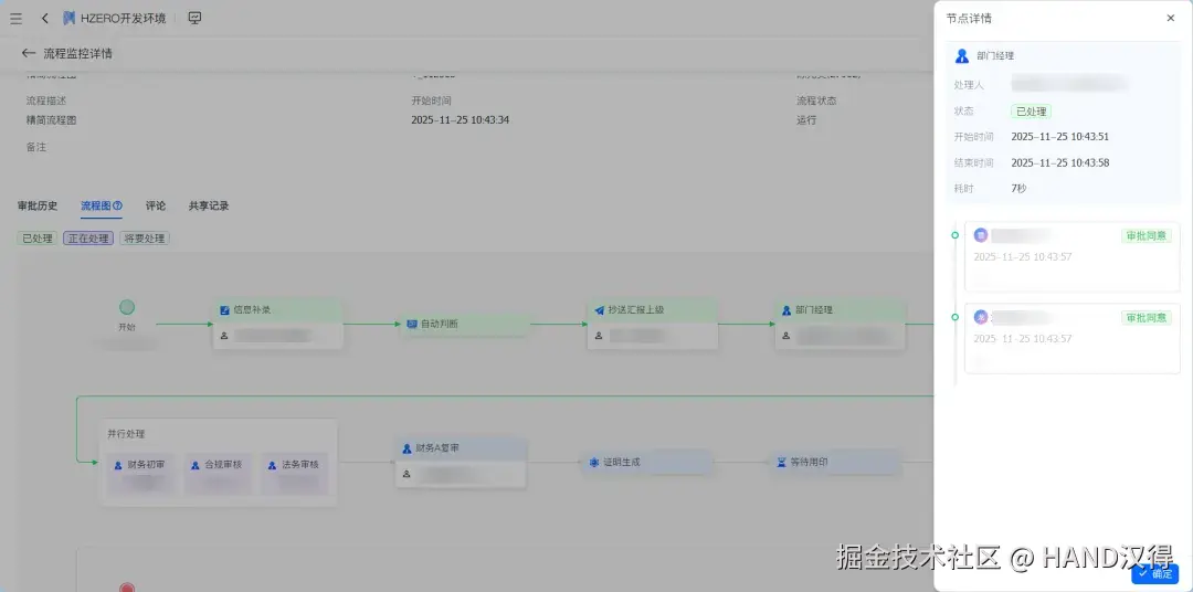 流程图将调整为串行展示,同时高亮显示当前正在审批的环节。点击节点,可查看节点上的审批记录。