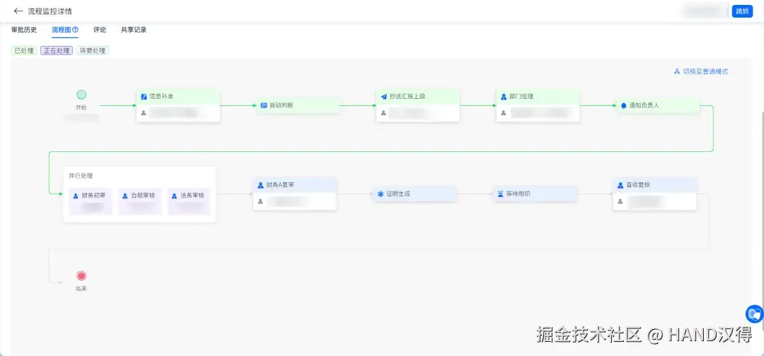 业务管理人员/流程管理员 双模式适配组织管理需求,在流程复盘 / 问题核对阶段,切换至详细模式,查看全节点处理人、流转轨迹,高效完成信息追溯。同时针对不同复杂度的流程(如简单的费用报销、复杂的项目立项),可根据流程类型灵活切换模式:简单流程用精简模式提速,复杂流程按需切换详细模式补全信息,平衡效率与管理颗粒度。