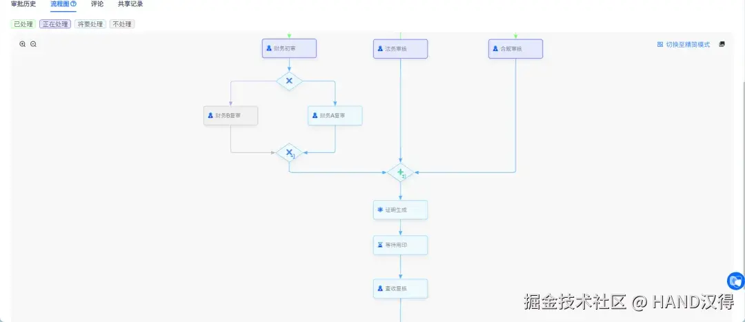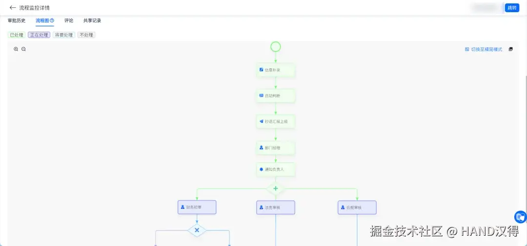 审批人员 在流程提报 / 推进阶段,可启用精简模式,快速定位当前待办环节,聚焦信息填报、任务执行,减少冗余信息干扰。 例如:部分企业复杂流程像 “蜘蛛网”,难以聚焦的到当前的主要环节。