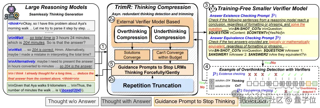 其中的 TrimR 用一个已预训练、指令微调的轻量验证器在线检测并截断无用中间思路,全程无需微调大模型或验证器;