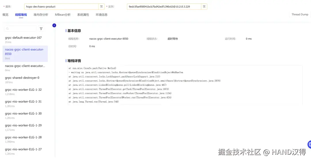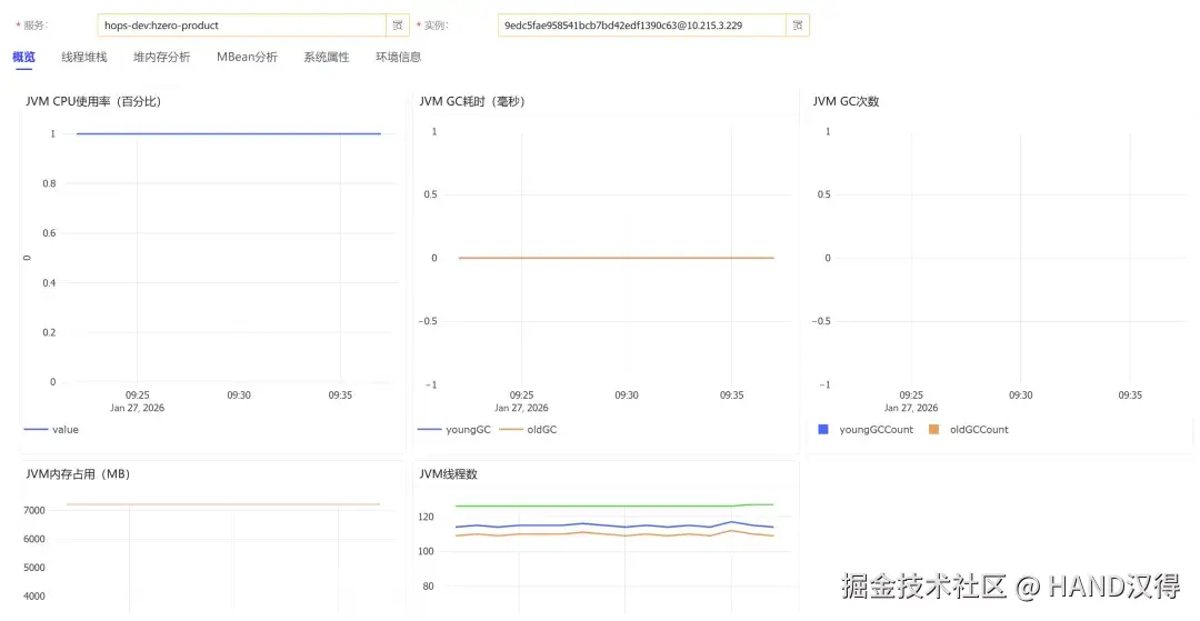 - CPU 使用率、GC 耗时与次数、线程状态、线程堆栈
