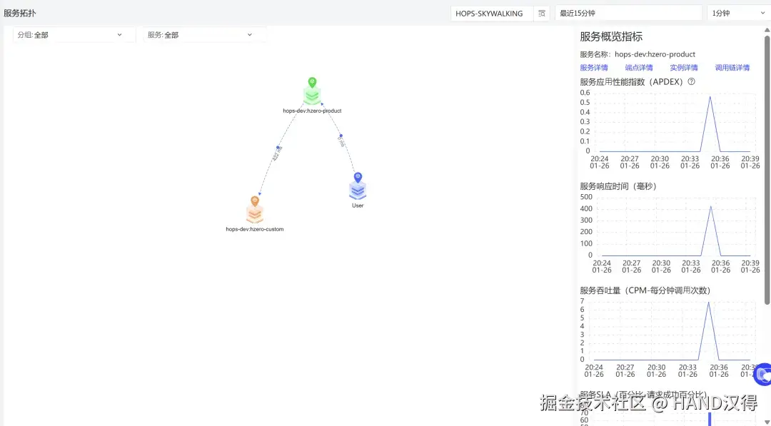 - 服务实例上点击可查看服务应用性能指数(APDEX)、响应时间、吞吐量、SLA、响应时间分布等指标