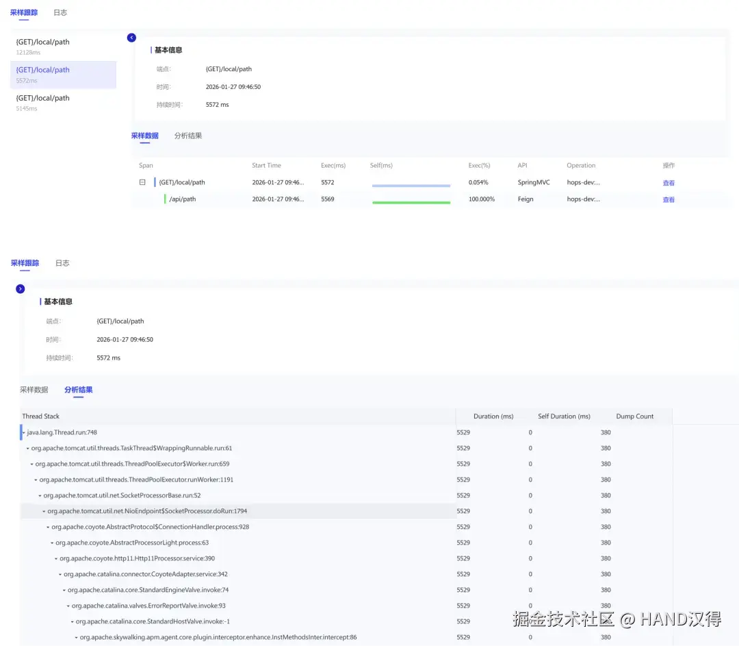 通过采样跟踪与性能剖析任务,鲲苍可对指定 API 在一段时间内进行方法级堆栈分析,并以火焰图形式呈现调用链。宽而平的“平顶”函数,往往就是性能瓶颈所在,问题定位更直接、更高效。