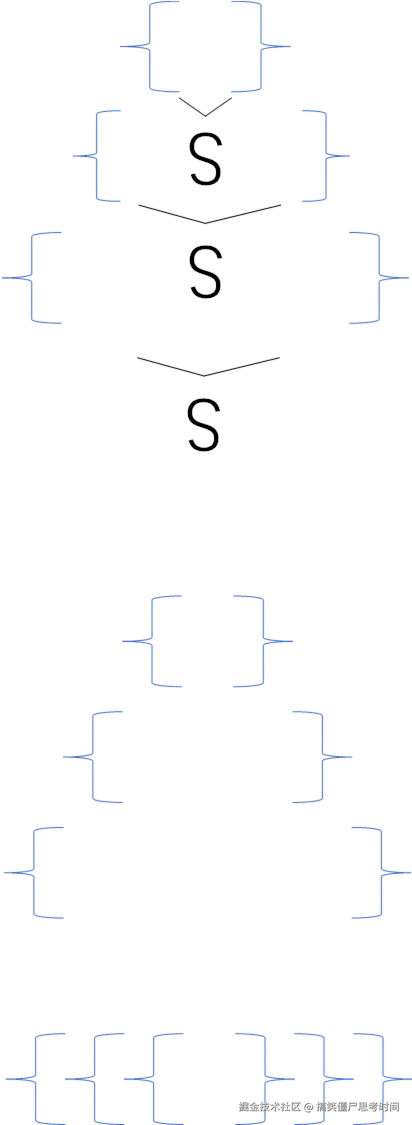 随手写出来一个三层的花括号嵌套{{{}}},盯着另一边的S->{S} | {}文法,陷入了沉思: