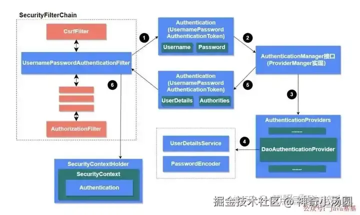 UsernamePasswordAuthenticationFilter:如果你不想引入过多的概念和复杂度,可以提供自己的Security Filter,从而完全脱离该框架。但是需要确保认证结果模型Authentication仍然被正确处理,并且将结果通过方法SecurityContextHolder.getContext().setAuthentication放入Security Context中。