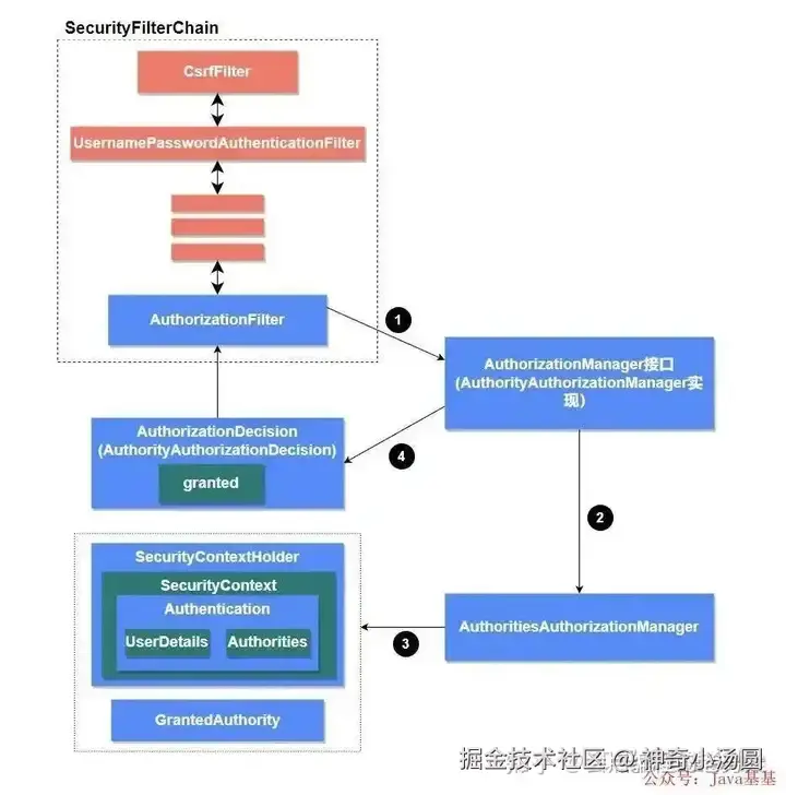 AuthorizationFilter,进而调用AuthorizationManager#check方法进行权限校验。 - 实际的校验工作继续委托给