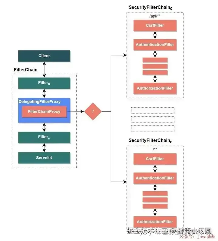 SecurityFilterChain(通过matches方法)。 SecurityFilterChain不是我们以为的JakartaEE的Servlet Filter实现,它仅仅是一个包含多个Filter的容器,本身不负责调度和执行。它只是一个配置项,用于指定一组Filter,以实现特定的安全需求。