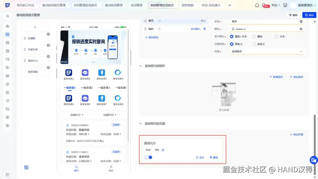 从报销管理的全流程可视化,到合同管理的全生命周期管控,飞搭移动端首页自定义功能,可精准适配企业办公核心场景需求。无需编码基础,仅通过拖拽组件、微调样式,就能搭建出贴合业务、视觉统一的专属首页,兼顾高效性与专业性!