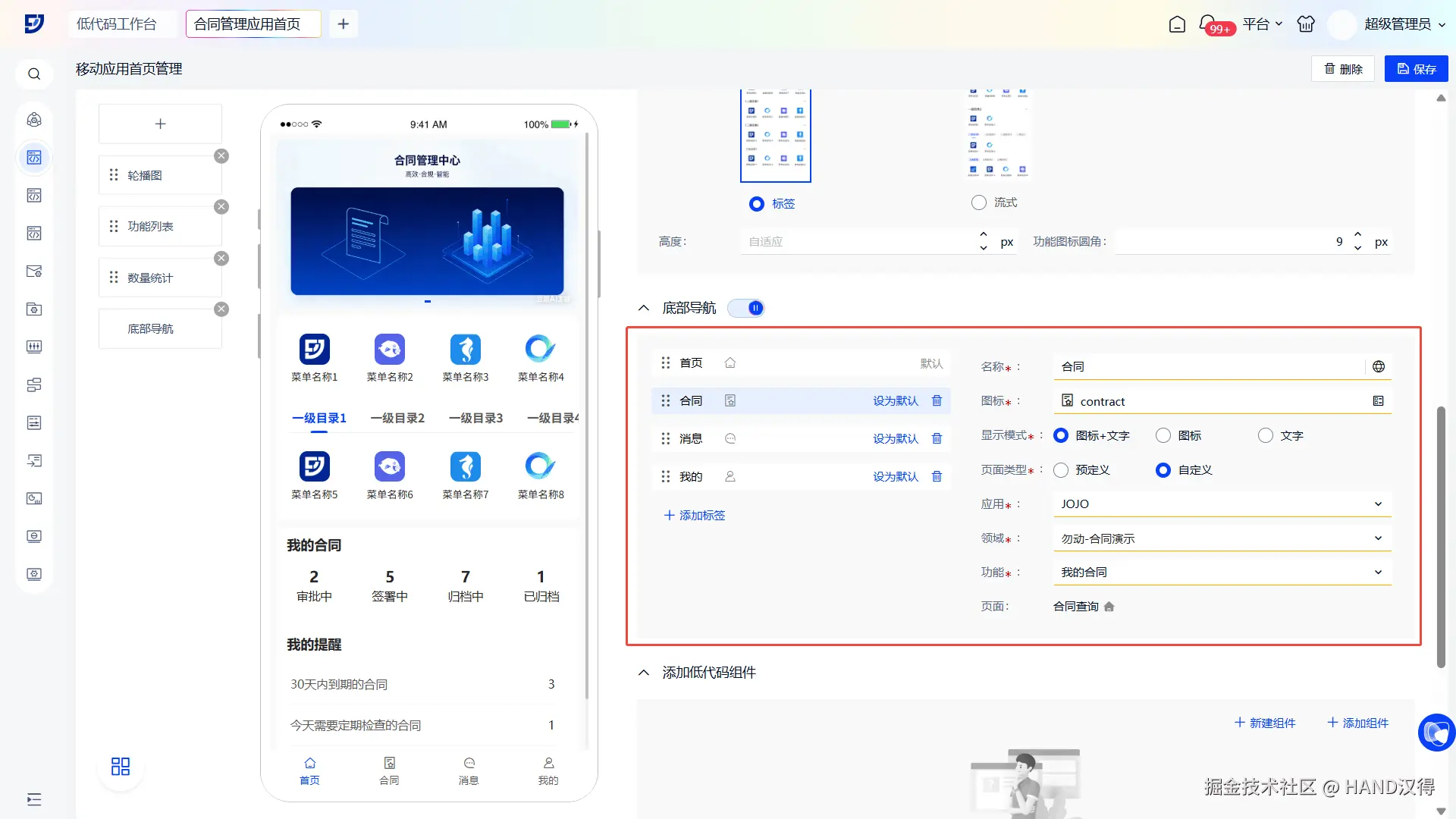 首先在移动应用首页管理菜单中创建应用首页,然后配置合同管理相关的功能,步骤如下: