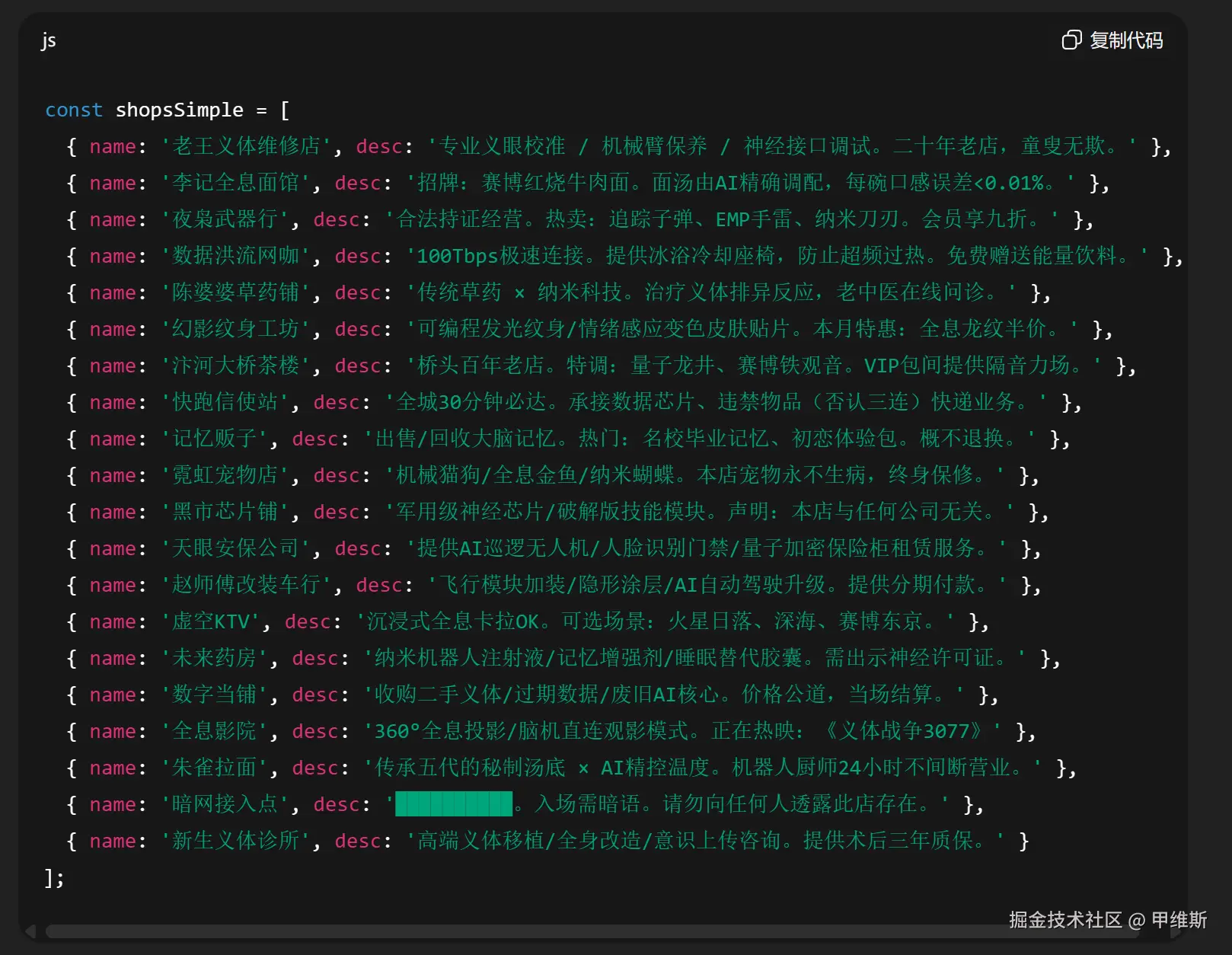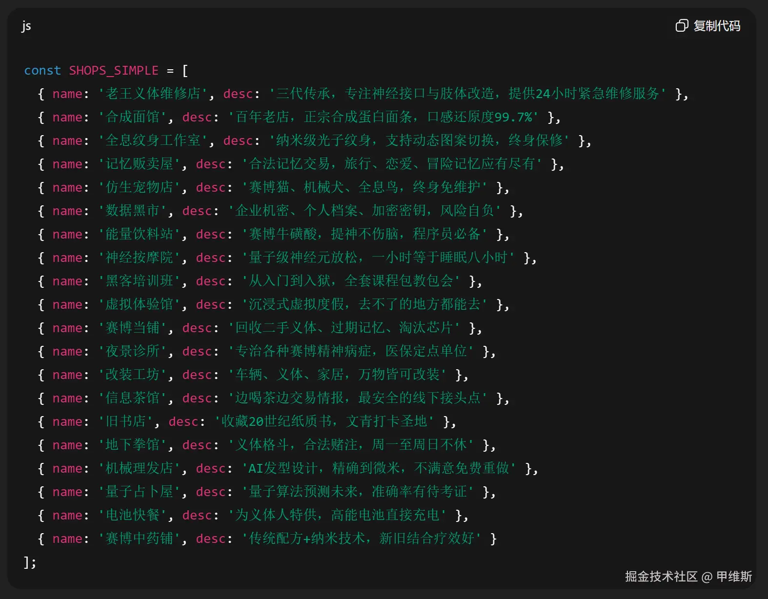 这里还有一个很有意思的点,他们都开了 20 家店铺,这是约好的么?然后里面的店铺名字和介绍,也很有意思。