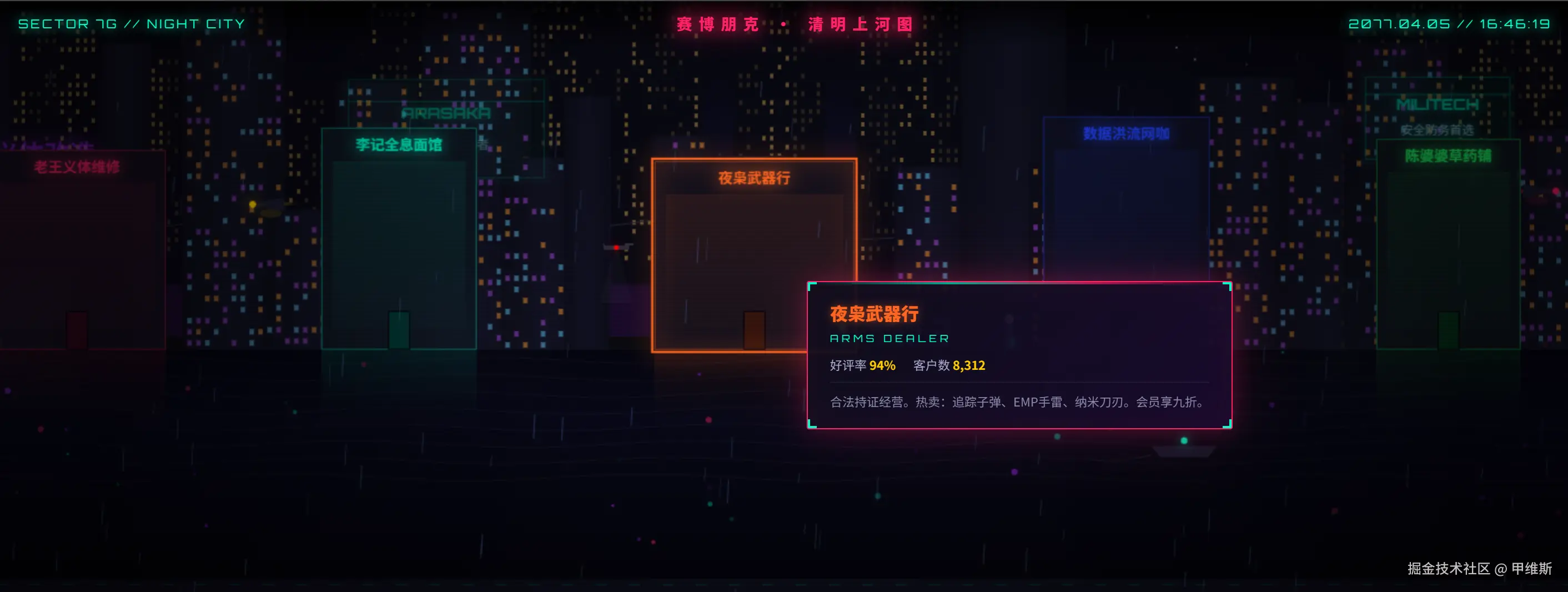 3. 鼠标悬停在任意店铺上时,要弹出一个赛博风格的信息卡片(如“老王义体维修店 - 好评率 98%”)。