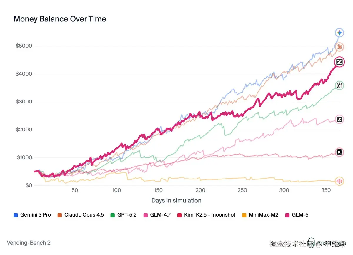 在自动售货机基准测试 2 中,GLM-5 在开源模型中排名第一,最终账户余额为 4432 美元。接近 Claude Opus 4.5 的水平,展现出强大的长期规划和资源管理能力。