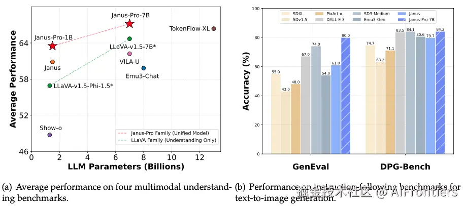 Janus-Pro是Janus架构的升级版。通过优化训练策略、扩展训练数据和增大模型参数(1B -> 7B),Janus-Pro在多模态理解和文生图指令遵循能力上取得了显著提升,证明了Janus架构具有良好的Scaling Law(尺度定律)特性 。