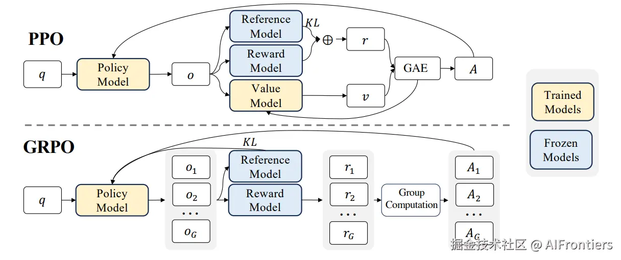 GRPO算法详解: 传统的RLHF(基于人类反馈的强化学习)通常依赖PPO算法,需要训练一个与策略模型同等大小的评论家模型,这会带来双倍的显存和计算开销。DeepSeek-Math提出的GRPO算法摒弃了评论家模型,而是通过对同一问题采样多组输出(Group Sampling),利用组内输出的相对优劣来计算优势函数。这一创新不仅大幅降低了RL训练成本,还提高了训练稳定性,为2025年DeepSeek-R1的爆发埋下了伏笔。