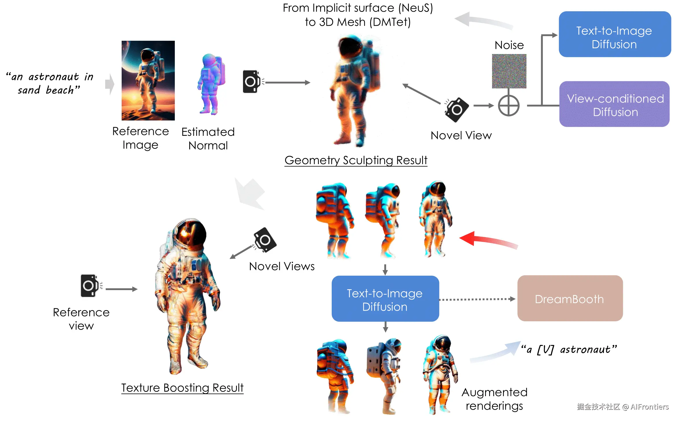 - 分层优化流水线:几何雕刻阶段融合 2D+3D 混合 SDS 损失、扩散时间步退火、渐进式视角训练等策略,从 NeuS 隐式表面表示过渡到 DMTet 网格表示,确保 3D 几何的多视角一致性;纹理增强阶段提出自举式分数蒸馏(BSD),通过交替优化 3D 场景与 DreamBooth 个性化扩散模型,实现纹理细节与视角一致性的相互强化。