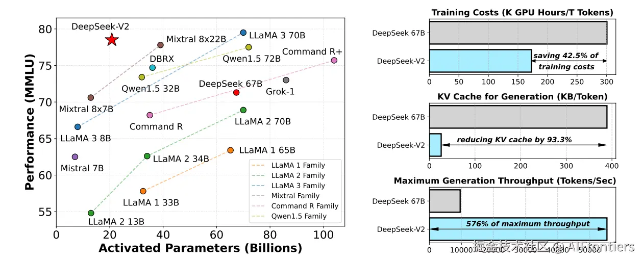 | 2024/5/7 | DeepSeek-V2 | 236B (21B激活) | MLA, DeepSeekMoE | 重新定义MoE架构,显存占用降93% |