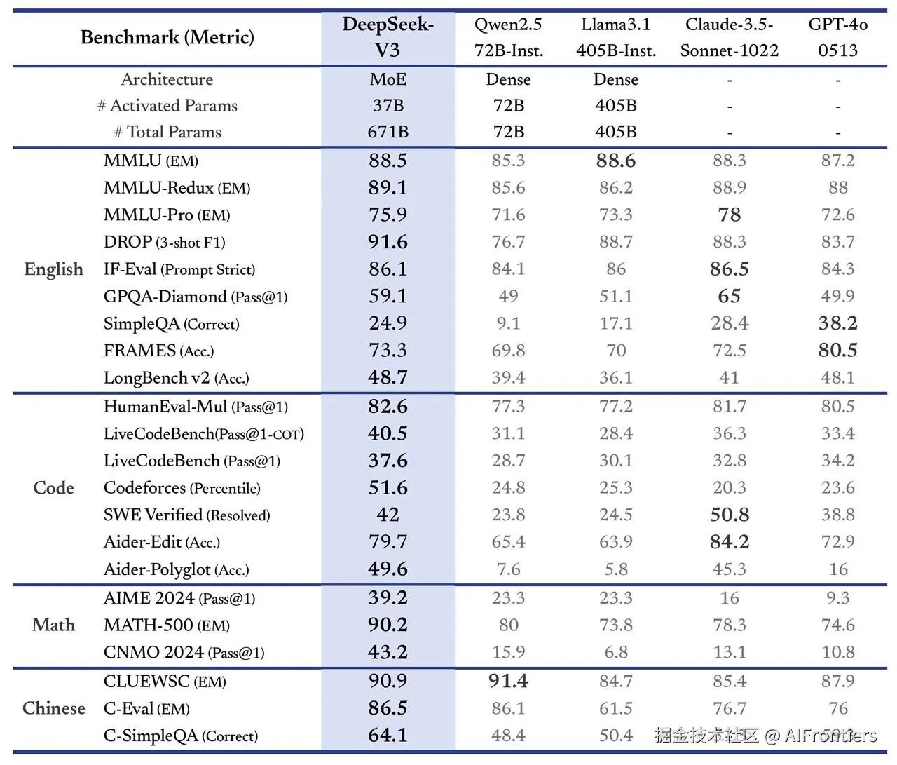 DeepSeek-V3在百科知识、数学、代码等维度的表现全面对标GPT-4o和Claude 3.5 Sonnet,成为当时最强的开源基座模型。