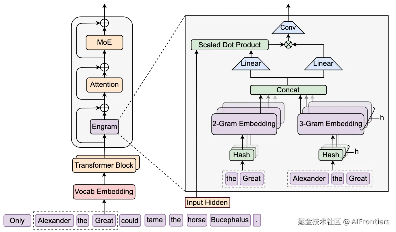 原理: 放弃了让模型时刻记住所有信息,而是建立了一个外挂的静态N-gram记忆库。模型通过高效的查表机制(Lookup)按需检索记忆,并将其与当前的动态隐藏状态融合。