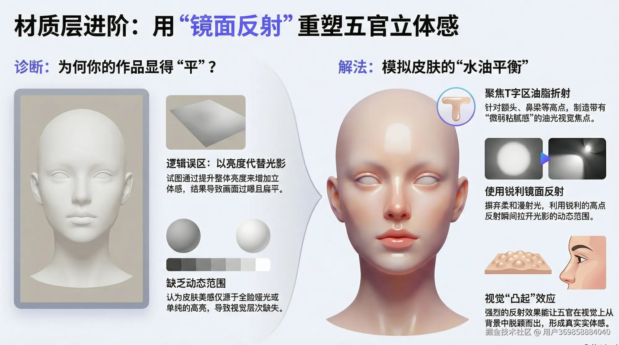 很多作品显得“平”,是因为创作者试图用整体亮度的提升来代替光影塑造,结果导致画面过曝且扁平。真实的立体感,源于皮肤表面的“水油平衡”。