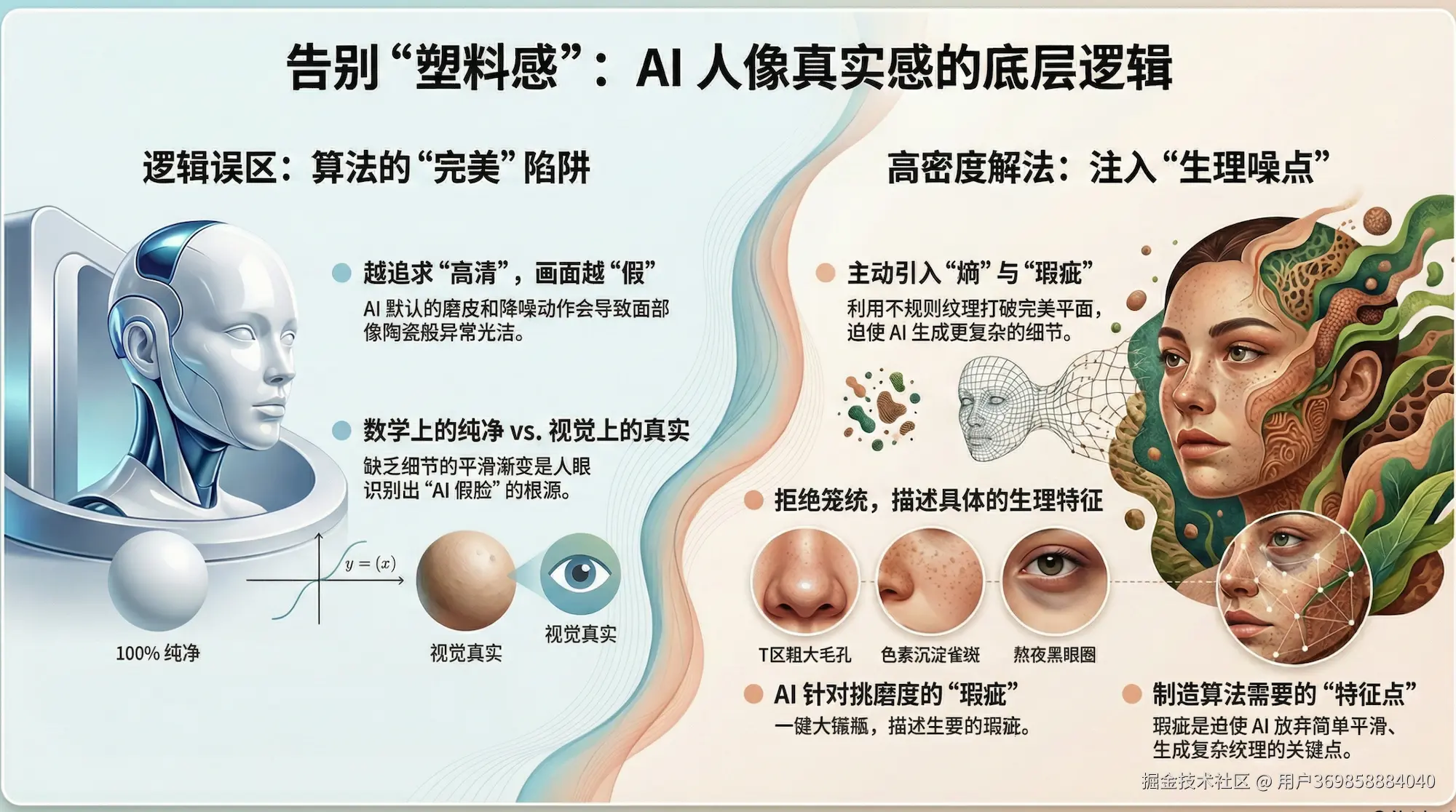 当你输入“高清”或“完美面容”时,AI 模型的默认动作其实是“磨皮”和“降噪”。这种数学上的纯净,正是人眼识别出“假”的根源。