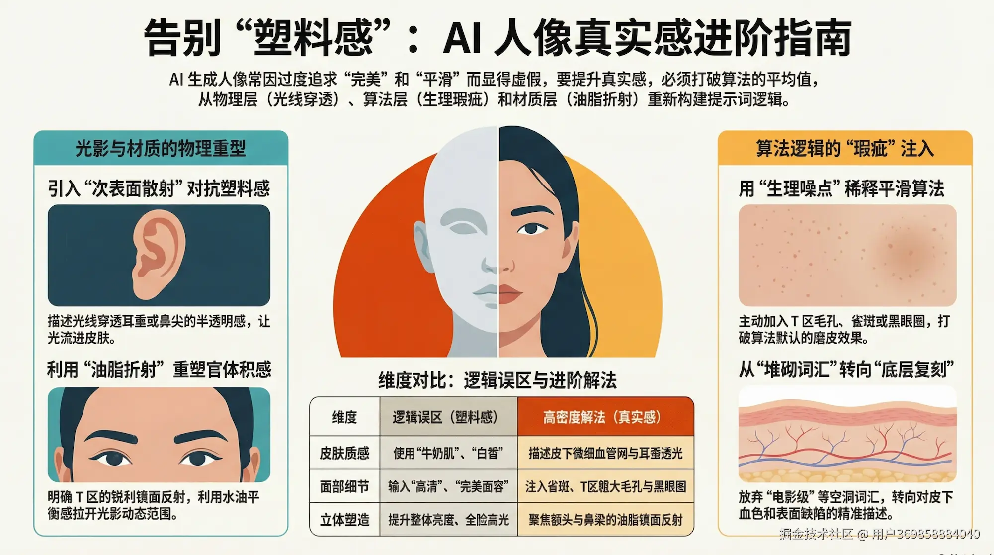 在 AI 的生成逻辑里,“美”往往意味着数据的平均值,而“真实”则意味着离散的噪点(即瑕疵)。要打破这种“算法计算出的完美”,你需要从物理光影、生理构造和材质反射三个维度,重新编写 AI 的底层生成逻辑。