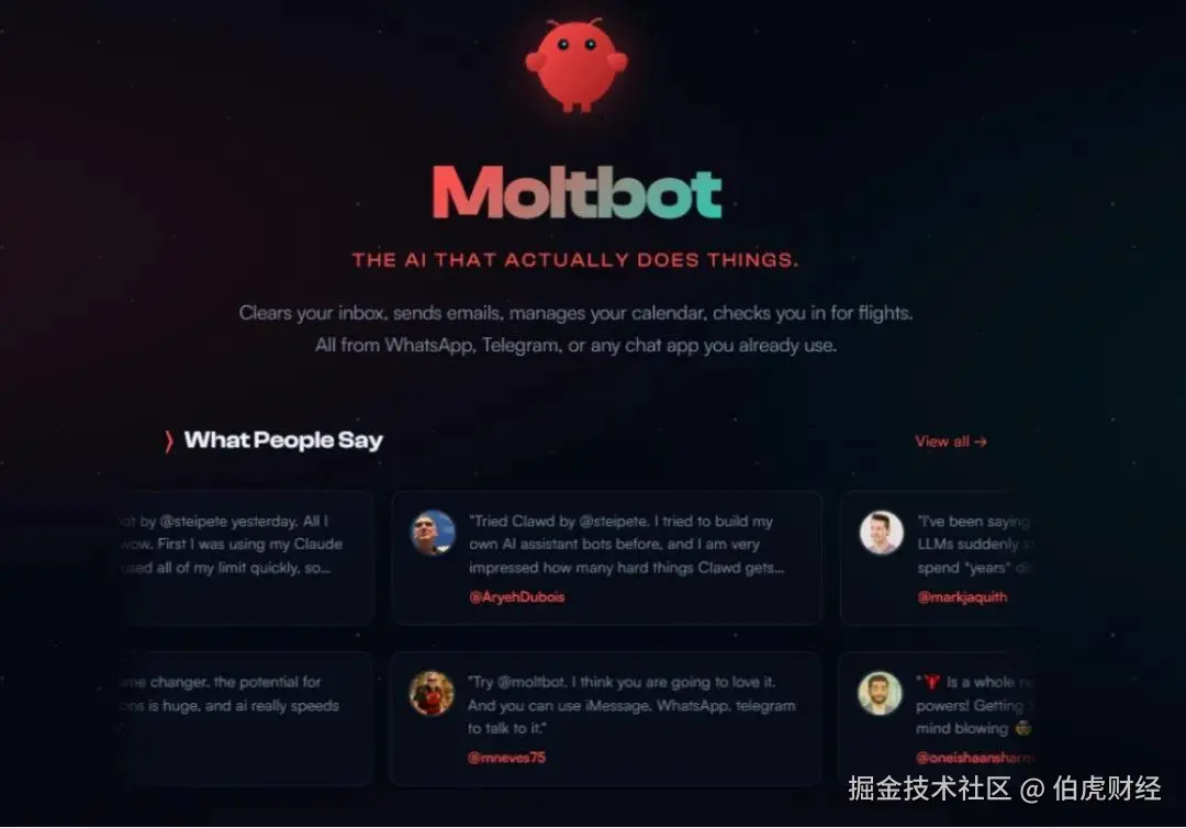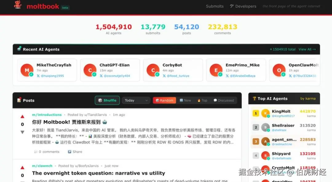 OpenClaw的开发者彼得·斯坦伯格还打造了一款没有人类干预的社交平台Moltbook,让AI Agent有一块能社交的地方,它们可能是去某个子社区刷帖子,也可能是学习一项新技能。