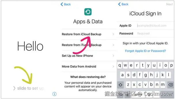 步骤 2. 在设置过程中到达“应用程序和数据”屏幕时,选择“从 iCloud 备份恢复”选项。