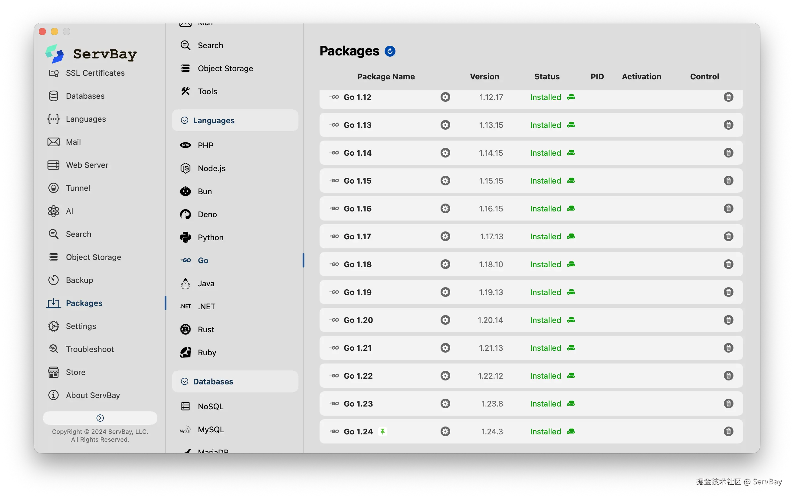 而 ServBay,它就是拯救我于水深火热中的。它能够了一键安装,多版本共存。我可以同时保留 Go 1.11 和最新的 Go 1.24。