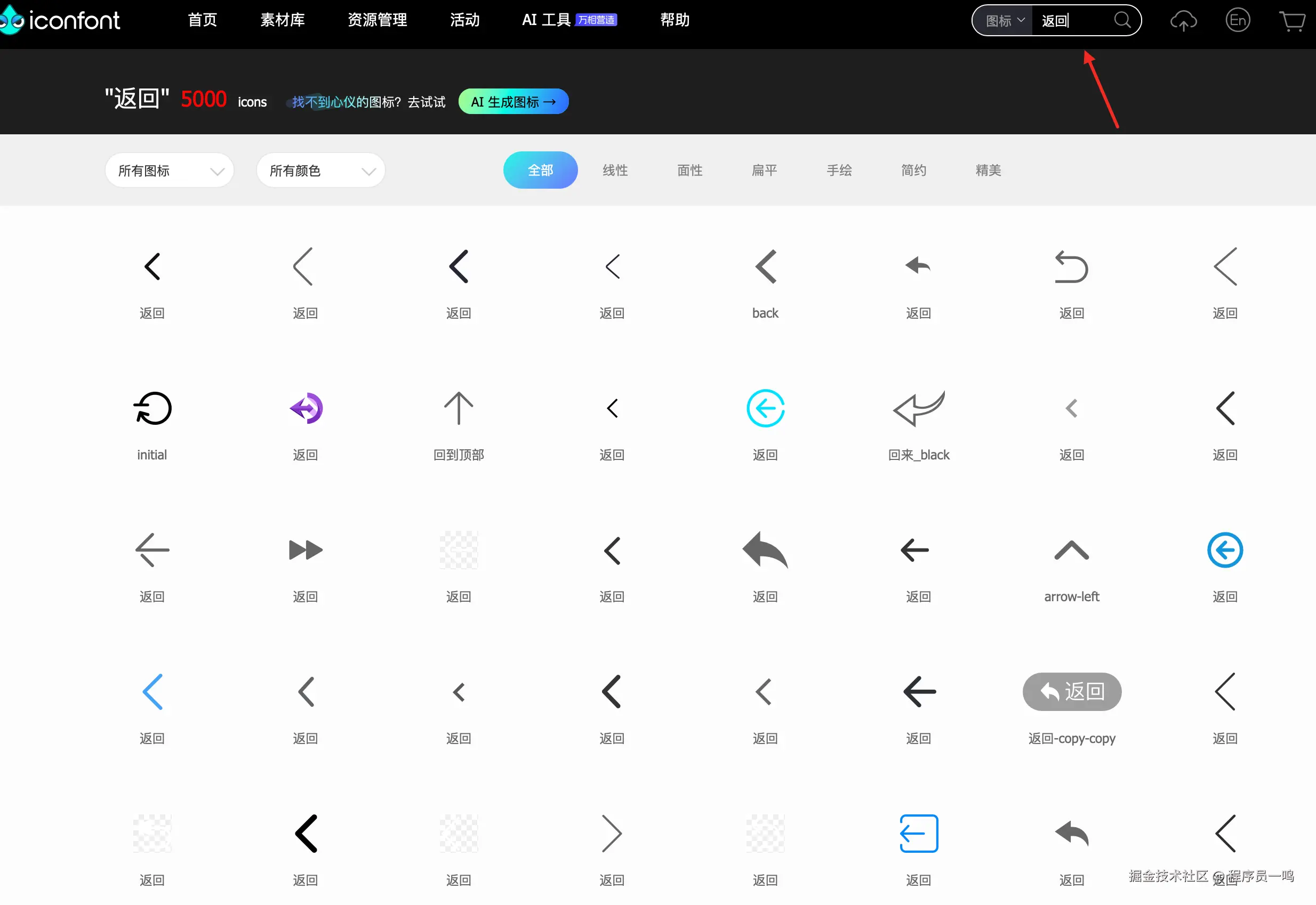 同样,也支持搜索,可以根据中文或者英文进行检索,非常的方便,比如搜索返回,那么就会罗列出无数个返回的图标,任你挑选。