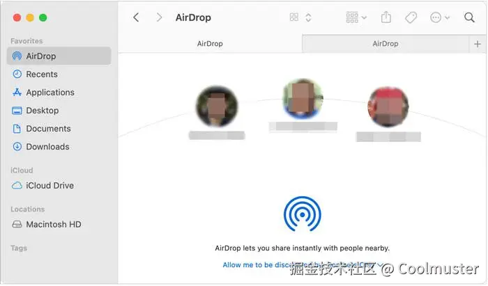 步骤2. 在Mac上,首先打开“Finder”,然后从左侧边栏中选择“AirDrop”。接下来,确保蓝牙和Wi-Fi已打开。在窗口底部,选择“允许我被发现”选项,可以设置为“仅限联系人”或“所有人”。