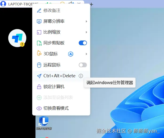右键点击窗口,还可以修改备注、设置屏幕分辨率、比例缩放、同步剪贴板、调起windows任务管理器等功能。