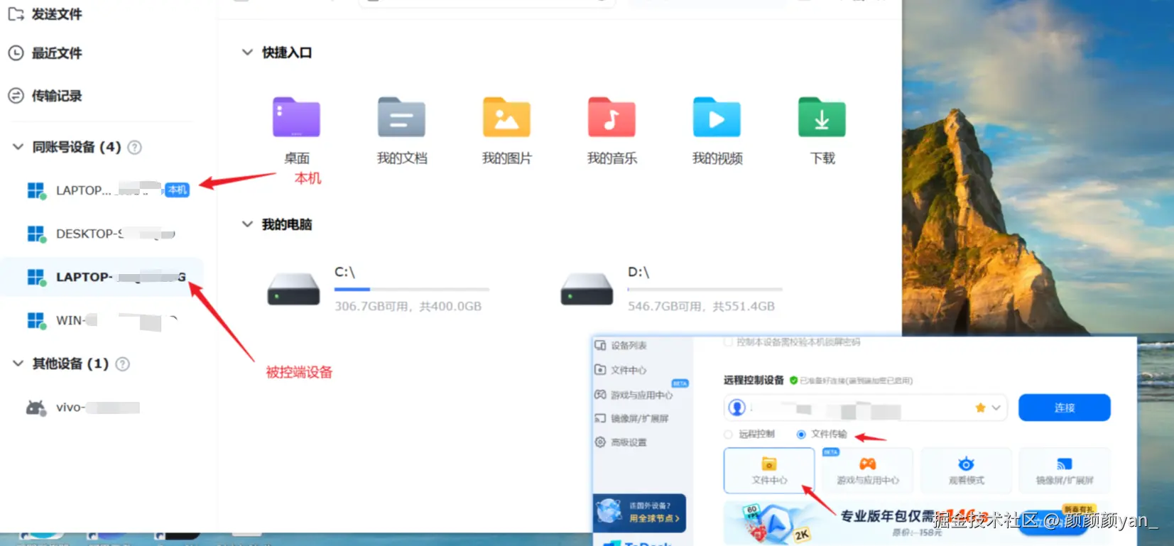 点击文件传输,文件中心,就可以看到本机设备和被控设备的磁盘列表,可以进行文件互传。支持PC/移动端跨系统批量传输(含拖放/剪贴板复制)文件,并提供统一界面管理记录。