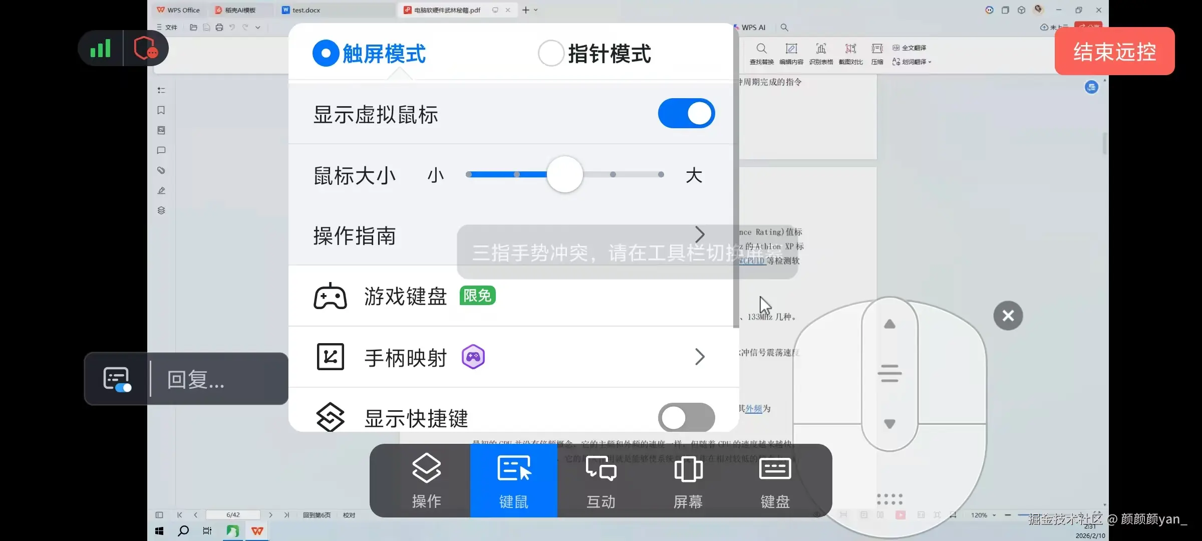 同时,手机连接电脑可以设置鼠标。包括触屏模式和指针模式,右下角可以显示虚拟鼠标。
