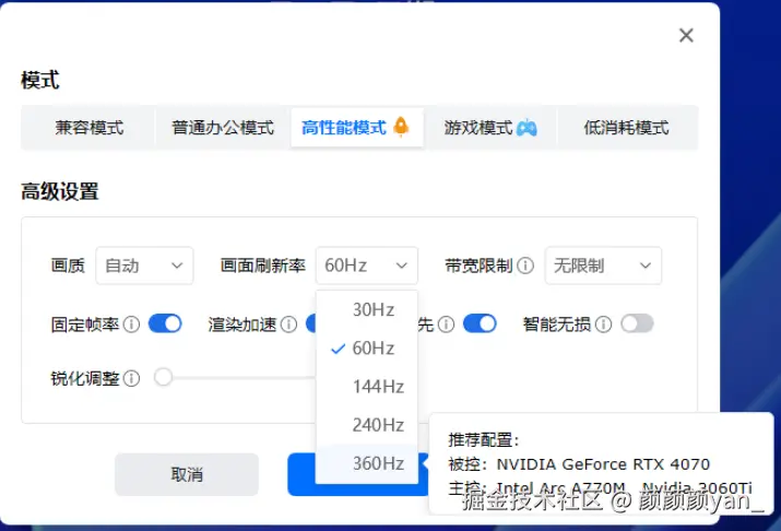 在高性能设备下,ToDesk 支持从 8K 60帧到 1080P 360帧的多档位配置。在实际测试中,高刷新率对滚动和窗口切换的体感提升非常明显,这一点在 Chrome Remote Desktop 中是无法体验到的。