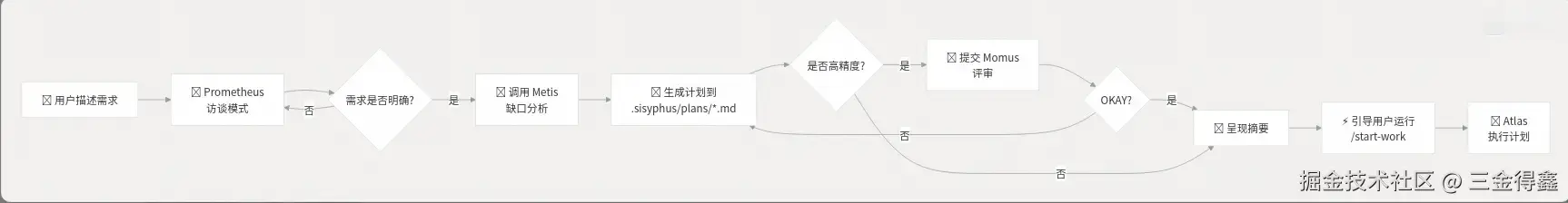 - Prometheus:战略规划师。Prometheus 是一个纯规划代理。我们可以理解它为其他 CLI 工具中的 Plan Mode。它不会一上来就给你写代码,而是通过访谈模式创建详细的工作计划。