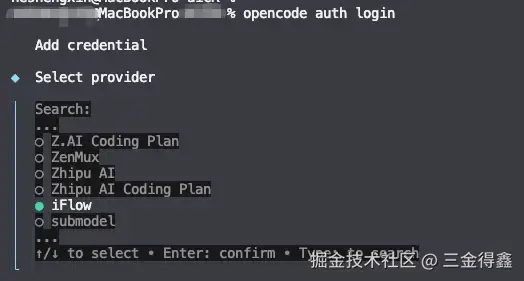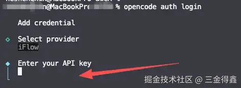 opencode auth login,选择 Iflow,并输入 API Key(可以在 iflow.cn - API 管理中获取);