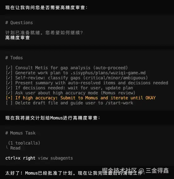 - Momus:计划审查者。不能光做计划不做审查对吧,Momus 就是一个绝对理智的计划审查者,专门用于发现阻碍执行的关键问题,确保计划是可执行的。