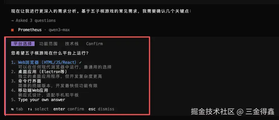- 如下图,Prometheus 会通过对话的方式跟我们确认细节。包括支持的平台、功能、技术展、UI、难度等等;