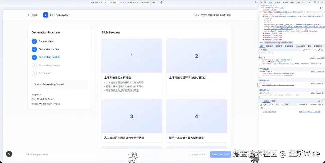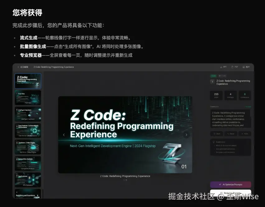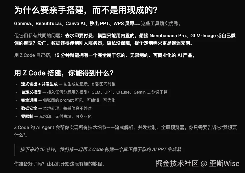官方说,15分钟就能拥有自己的AI PPT生成器,虽然我测试大概要1-2个小时,但对比正儿八经做PPT Agent的,好像又一个产品被革命掉了。